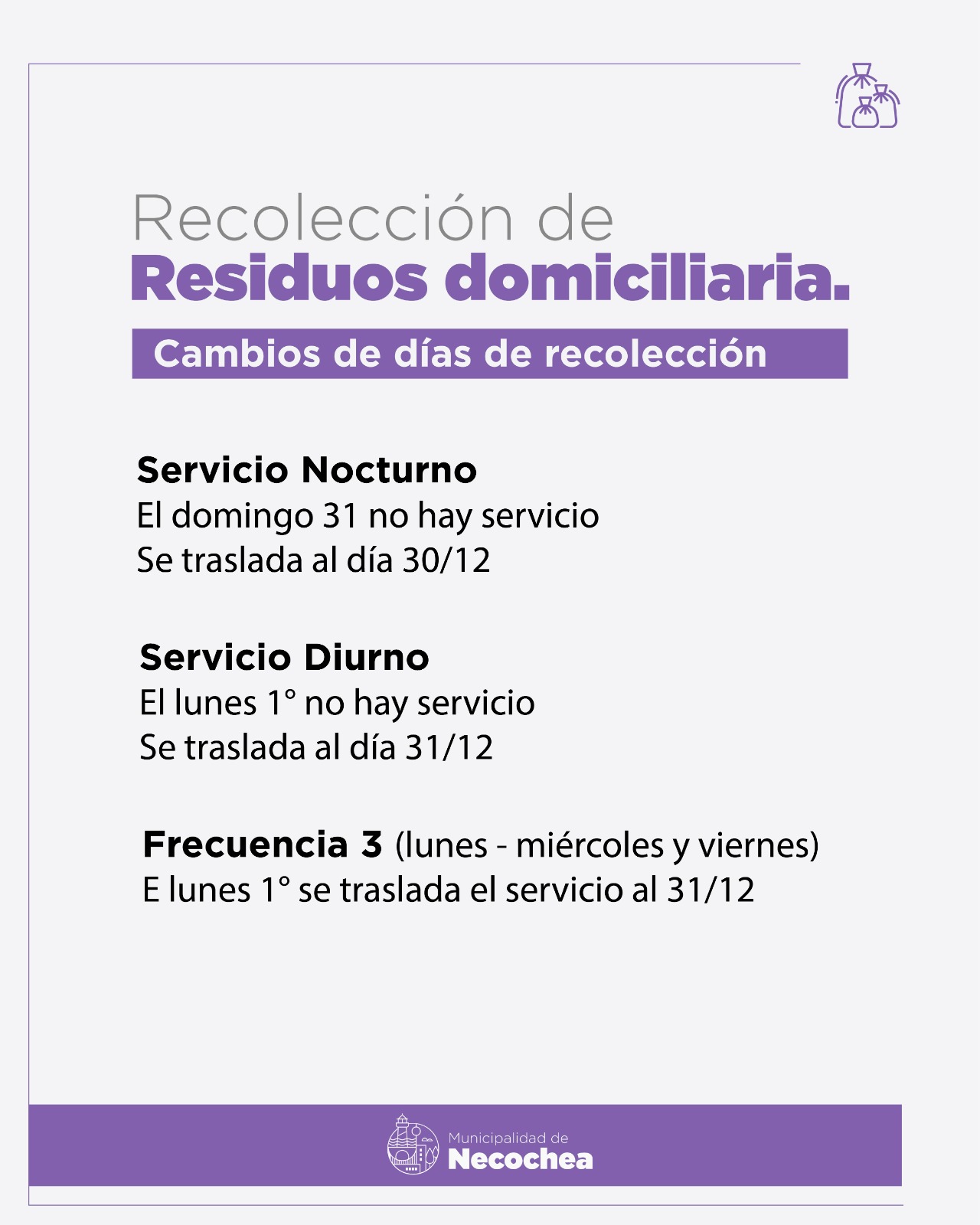 A través de la Secretaría de Planeamiento, Obras y Servicios Públicos, la Municipalidad de Necochea informa que, por las fiestas, la recolección de residuos domiciliaria se verá afectada con algunas modificaciones a lo largo del próximo fin de semana largo.