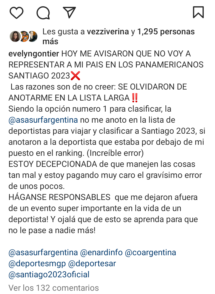 La deportista necochense, referente de la especialidad longboard, apuntó en sus redes sociales contra la Asociación Argentina de Surf, al decir que no fue incluida en la lista de deportistas que viajarían a los Juegos Panamericanos de Santiago de Chile, cuando ella estaba clasificada para la citada competencia.